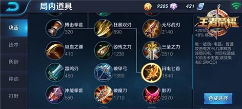 闪电匕首:+30%攻击速度 +20%暴击率 +8%移速唯一被动-电弧:普通攻击有20%几率释放连锁闪电,对目标造成100法术伤害(该技能有0.5秒CD)