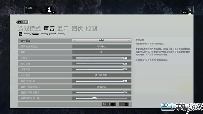 按Tab键切换选项卡到“声音”(对的!声音!你没有看错)。第一个使用语言是游戏语音的语言,小编下载的版本应该不包括语音包,所以只有English,不知道Steam版本中有没有包含语音包。第二行就是改变游戏中界面和字幕的语言啦。方向键选中最后一个,就是中文了。(官方说不带简体中文,但是现在能下载到的版本是自带简体中文的)