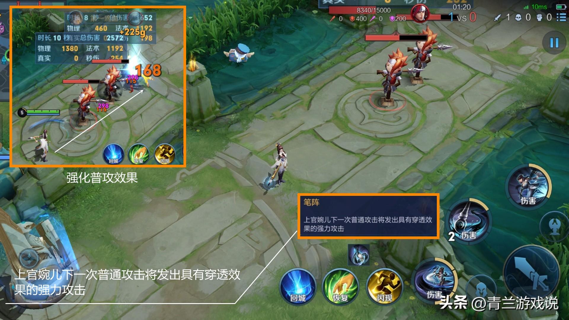 重点提示:上官婉儿强化普攻的触发方式有两种,即连续释放普攻和触碰到笔力。