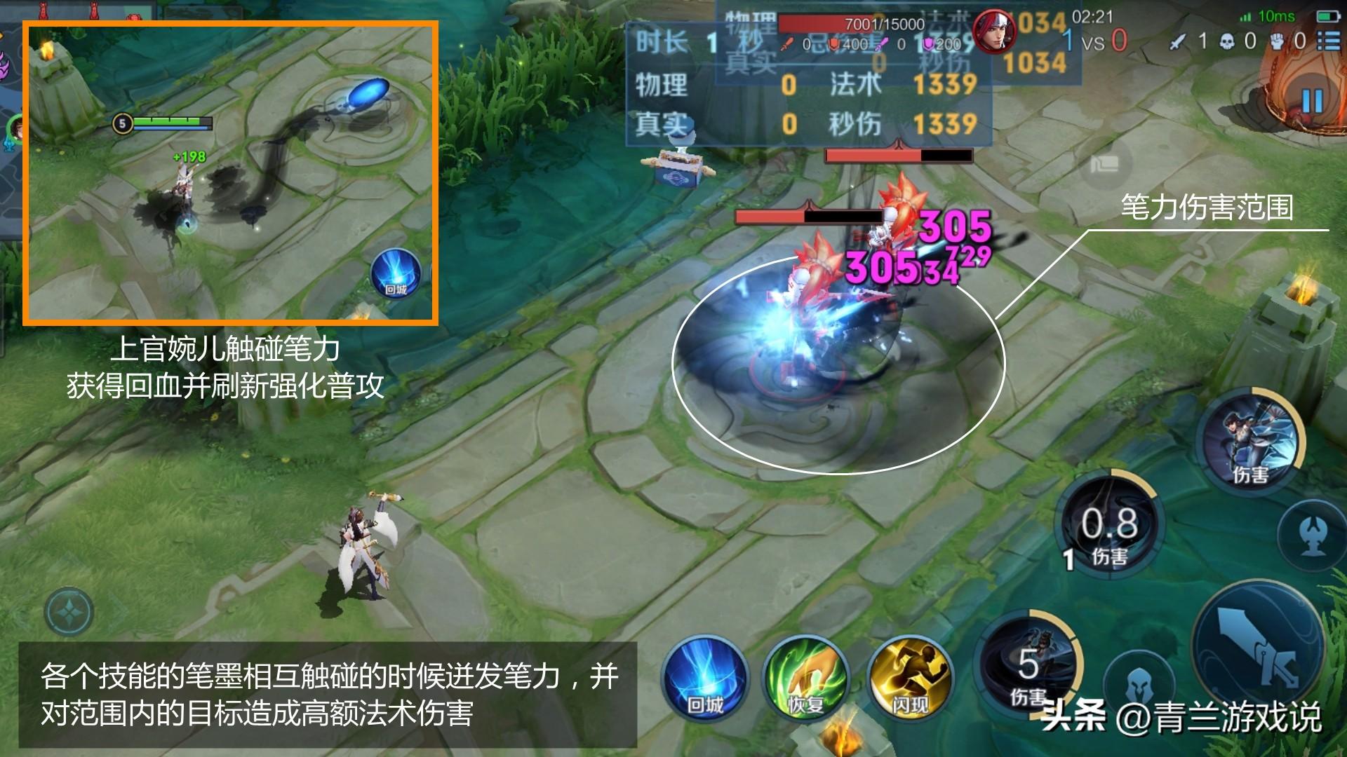 首先需要知道的点则是笔力触发的范围,可以将其理解为上官婉儿大招或者闪现的大小,所以1、2技能的交汇点一定要靠近婉儿。