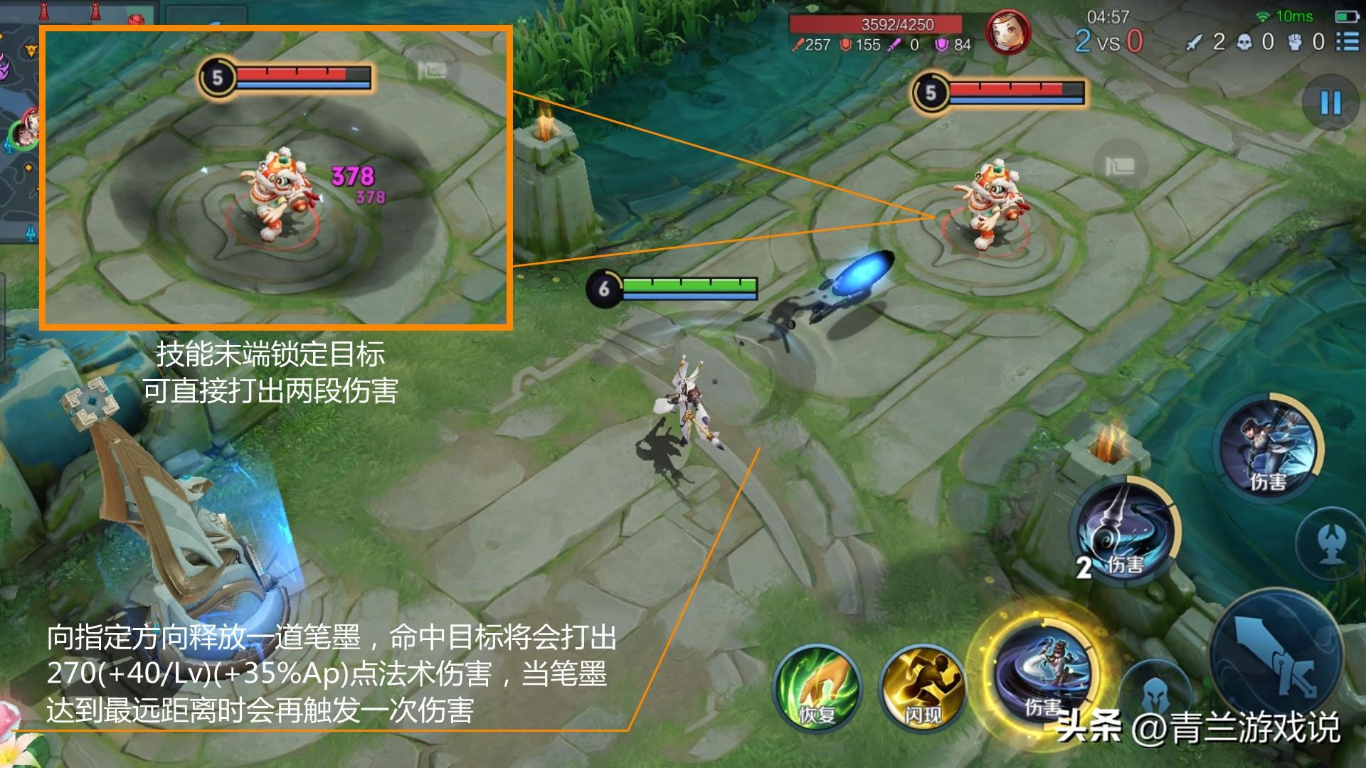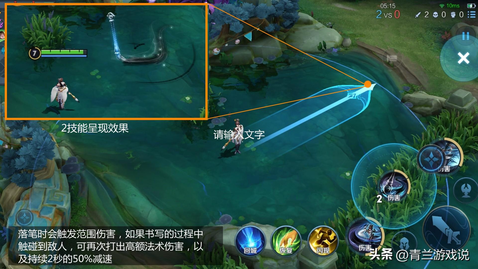 补充:关于被动技能中的“触碰笔力”,可以借助1、2技能由内向外和由外向内的机制,在被对手追击时,可向逃跑丢2技能,靠近笔时再丢出1技能。(获得强化普攻的同时打出笔力伤害,并获得血量回复,此时便可找机会进行反打)