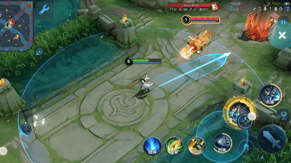 技能与技能之间的碰撞,同样可以触发范围伤害,如果将目标锁定在1、2技能的最远攻击距离,通过2、1连招可以更好的触发以上被动效果,后期时通过技能的触碰伤害可以打掉敌方脆皮英雄大量的血量。