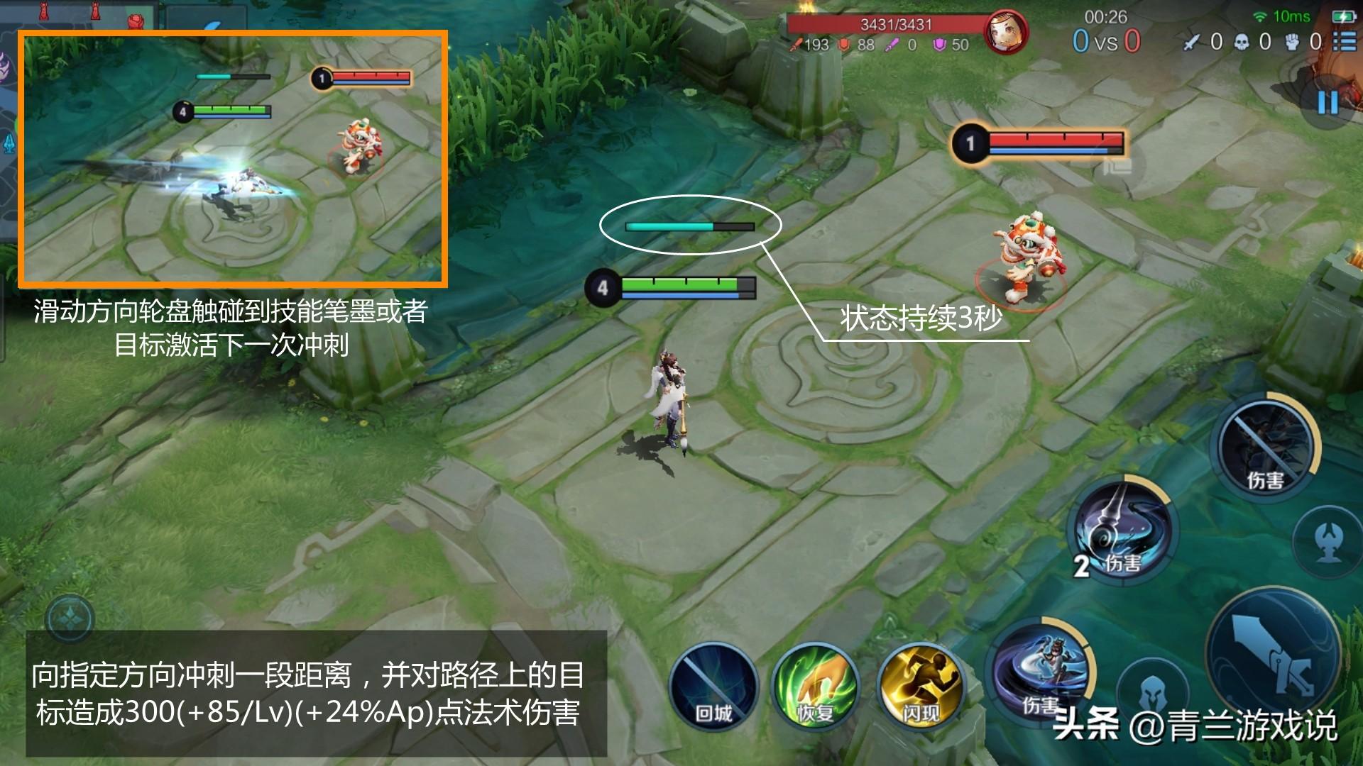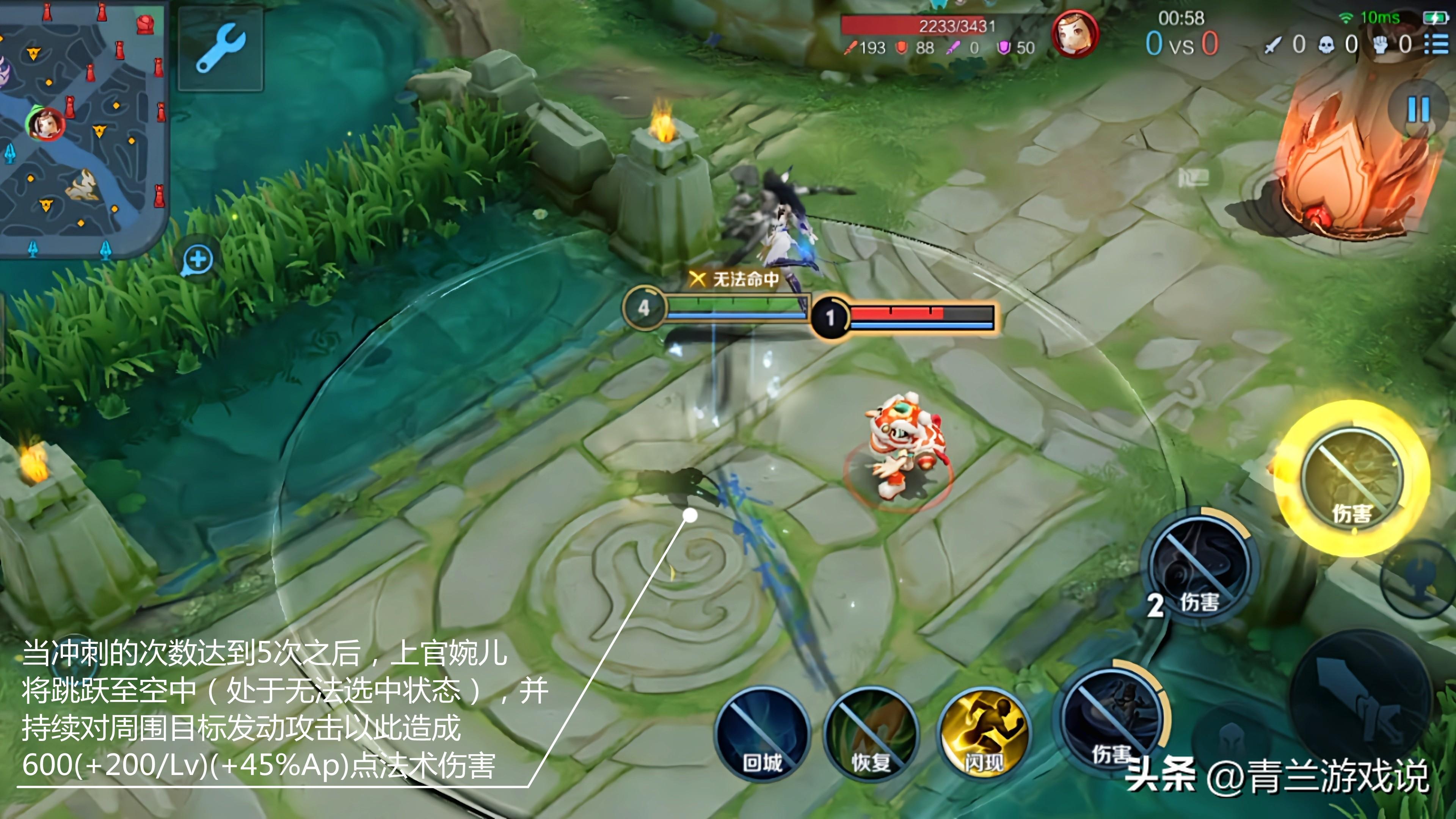 开启大招,移动轮盘上官婉儿会向指定方向冲刺一段距离,并对路径上的目标造成300(+85/Lv)(+24%Ap)点法术伤害。