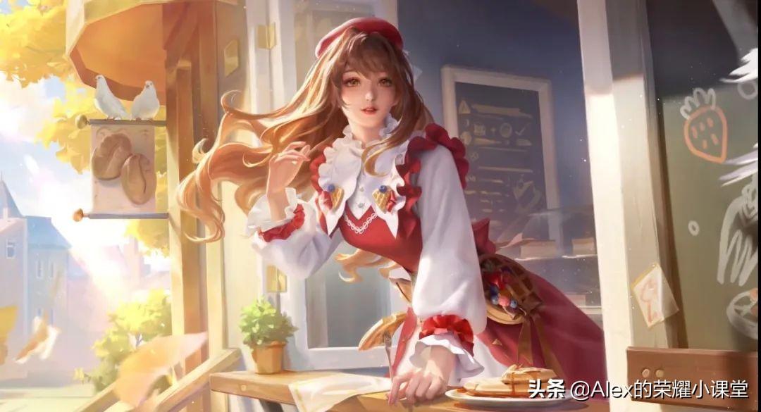 王昭君-午后时光品质勇者级别,王昭君身着红白色长裙、头戴贝雷帽,腰间佩戴了一个华夫饼的小包,整体画风非常甜美可爱。