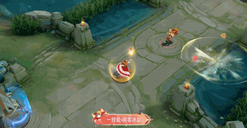 王昭君在指定位置操控碎裂冰晶,技能特效为淡黄色,命中敌人后会弹射出几个华夫饼。