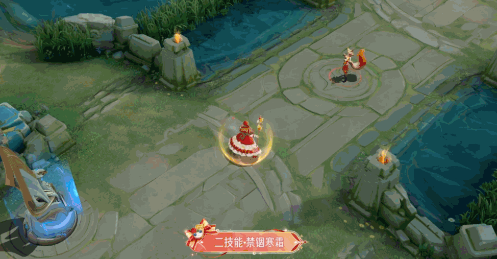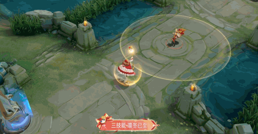 王昭君在指定区域引领寒霜之力,地面出现一个六叶草形状的图标,随后空中掉落几颗红色的草莓。