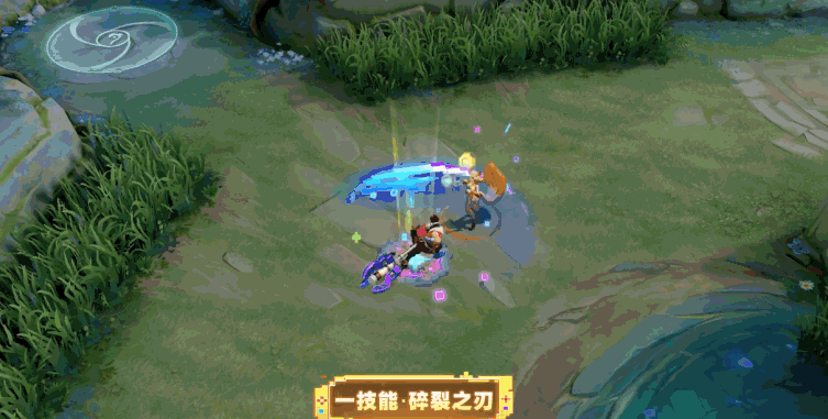 狂铁将武器重重砸向地面,形成一个蓝紫色的护盾随后蔓延至四周,特效上融入了渐变色彩以及动态像素的粒子效果。