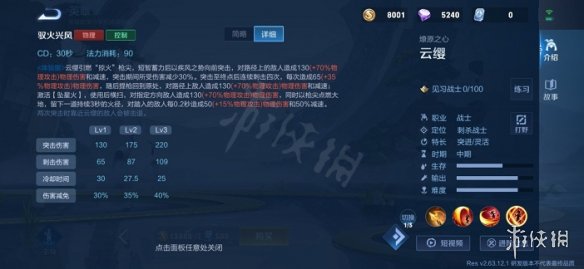 <体验服>云缨跃至空中,蓄势1秒后以“掠火”劈出燎原一击,枪尖喷薄而出的烈焰对路径上敌人造成400(+120%物理攻击)物理伤害,若敌人生命低于50%,受到的伤害额外增加100%。跃起期间可无视地形移动,并获得200%移动速度。