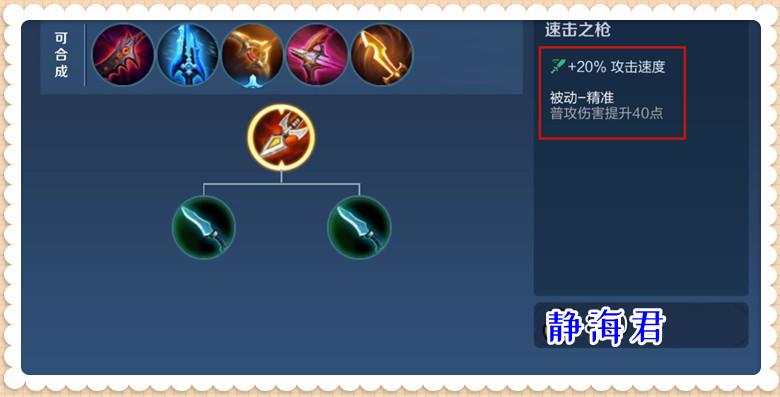 速击之枪的售价是880g,它的属性是+20%攻速、普通攻击伤害提升40点,我们将这件装备乘以2.5倍,最终可以得出2200g可以获得+50%攻速、普通攻击伤害提升100点。