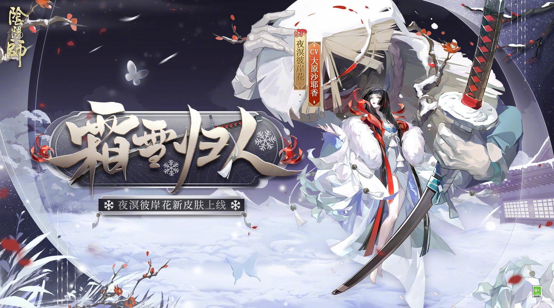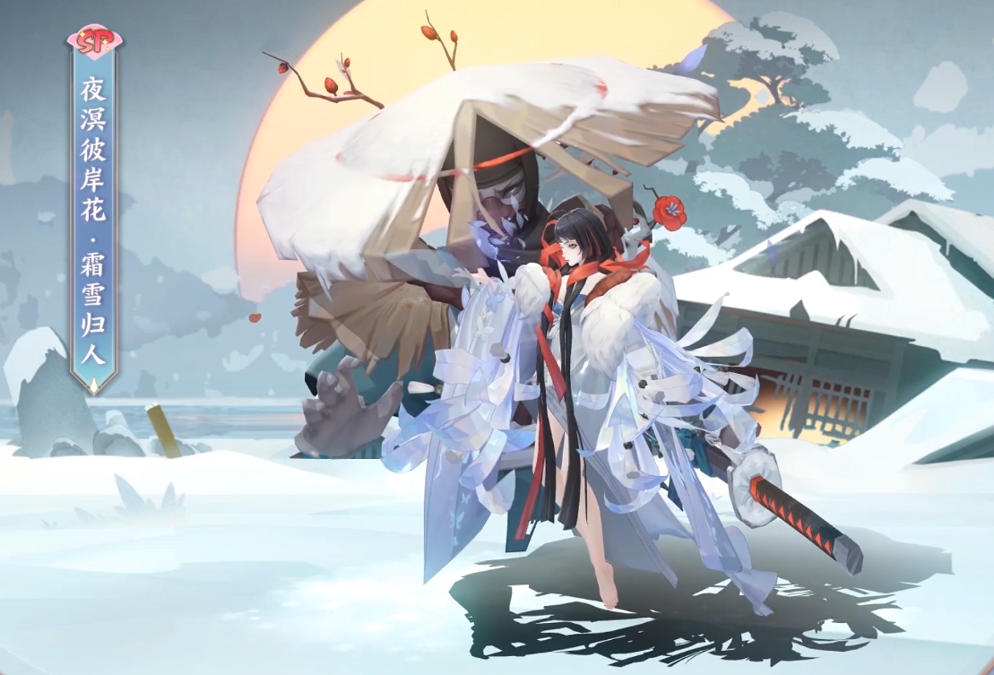 本次推出的是夜溟彼岸花的花合战新皮肤,其名为霜雪归人,通过参与11月开启的额花合战·霜月活动解锁,此外参与活动达到指定条件即可获得限定头像框'赤雪笠',氪金会解锁动态效果,还有两张专属的插画。
