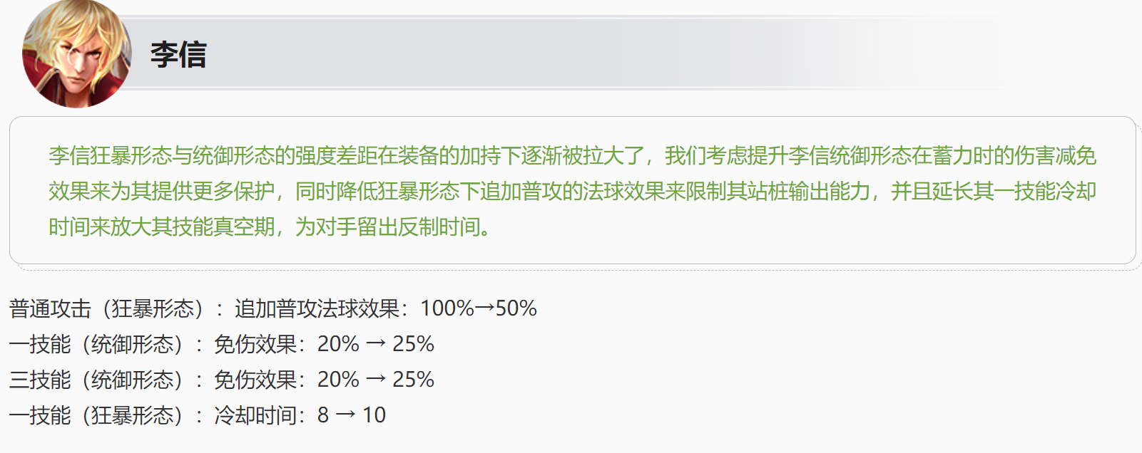 一技能和三技能的免伤效果提升了5%,是在李信进入统御形态下才可以的。
