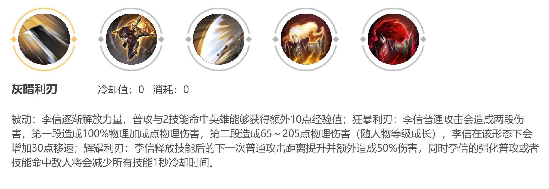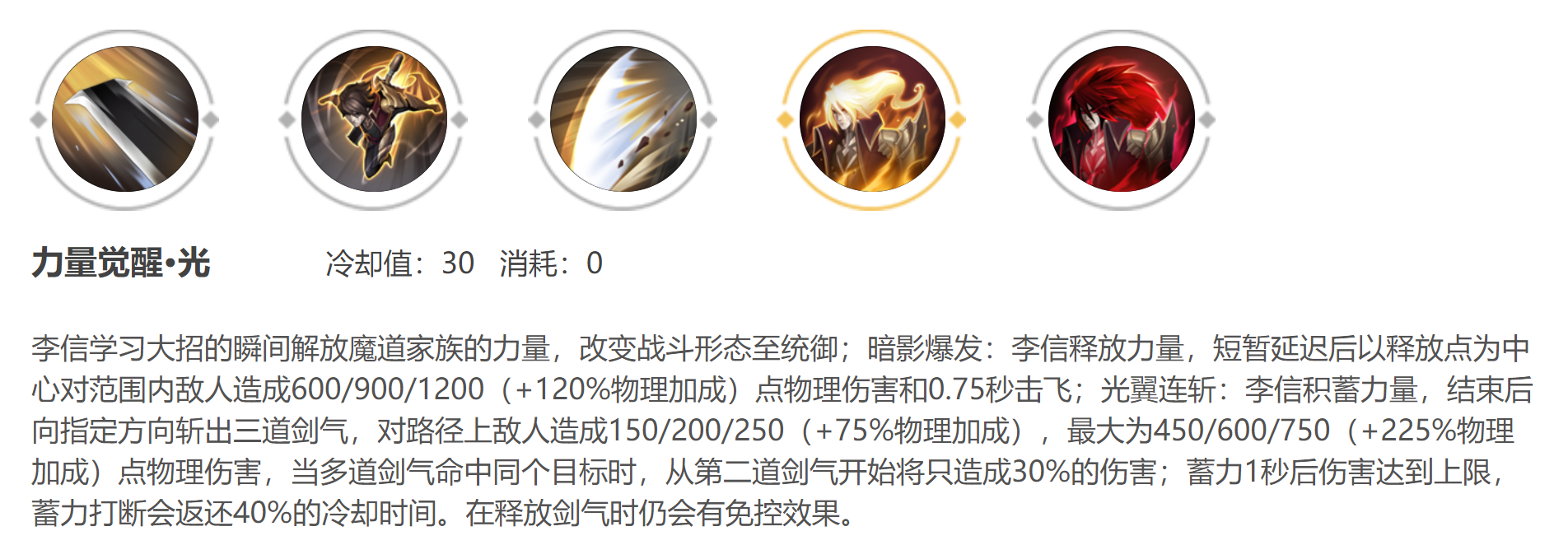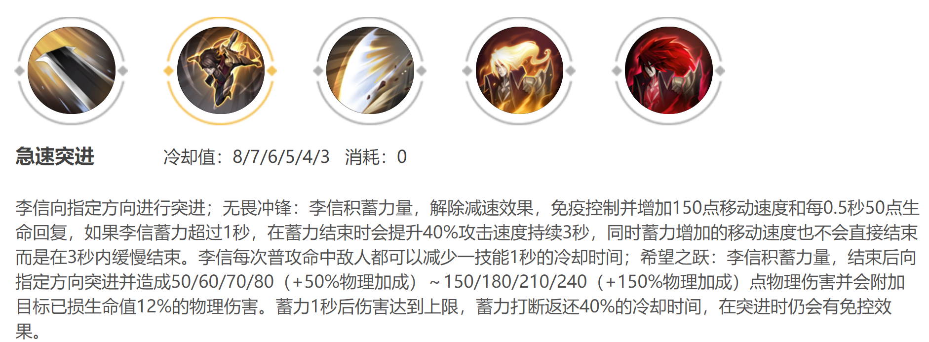 当李信使用一技能的时候,蓄力超过1秒,会增加40%的攻击速度,持续3秒的时间,在此期间,李信每命中一次敌人,就会减少1秒一技能的冷却时间。
