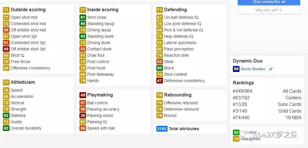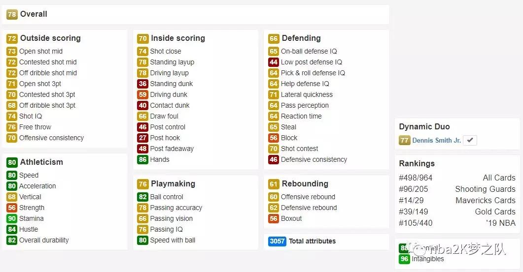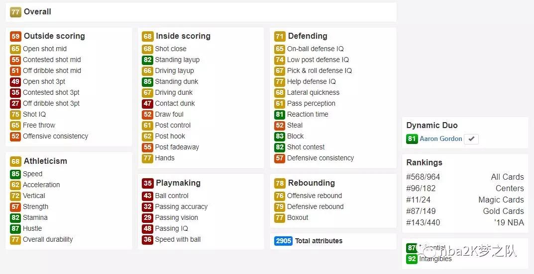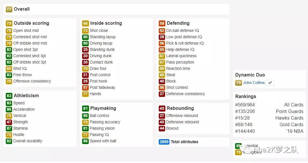 这张金卡的亮点不多,主要体现在不错的速度上(三速80),投射能力也基本都在70以上,其传球和组织能力也还不错,有着成为核心后卫的潜质。但东契奇的防守明显不够给力,能否防住NBA顶级侧翼球员尚未可知,而且他也没有绝对的身体优势,所以这张金卡使用起来并没有上面两位顺手。