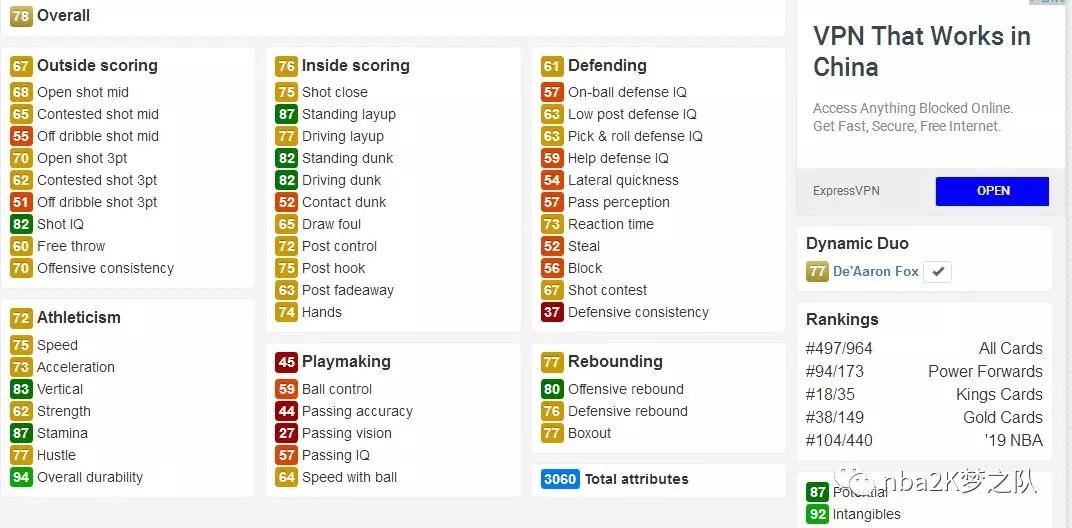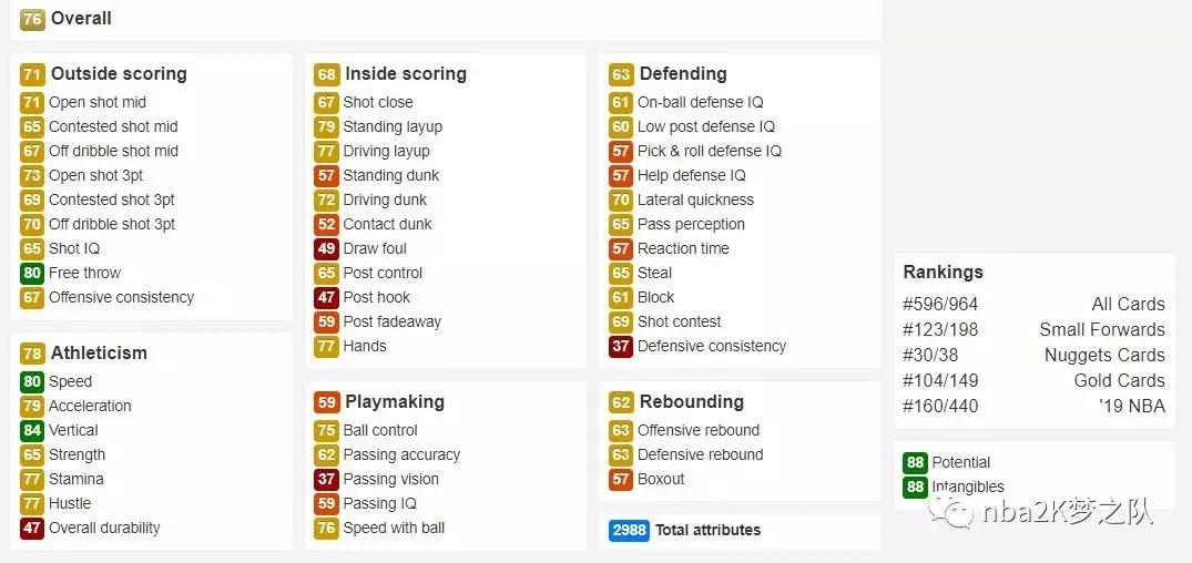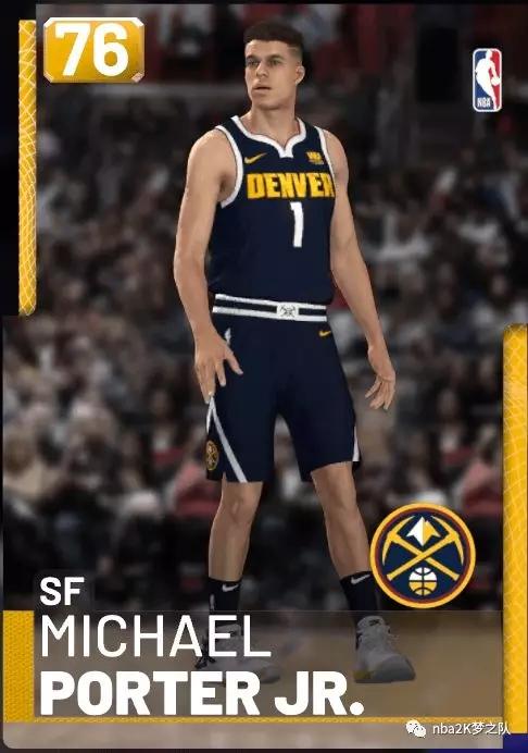 波特的最佳模板为保罗·乔治,最差模板为加里纳利,看见他应该是一名以投篮为主的小前锋。不过这张金卡的属性实在一般,但从一些细节中我们还是可以看到他未来的潜力。比如72的突扣和73的空位三分,而且2米08的身高在SF位置上也有着一定优势,这也预示着如果波特能摆脱伤病兑现天赋的话,那么他还是有可能成为一名进攻手段极为丰富的砍分狂魔。