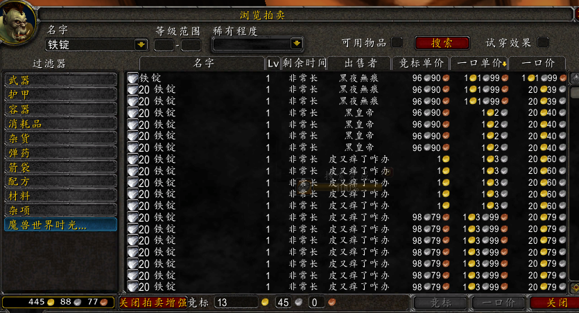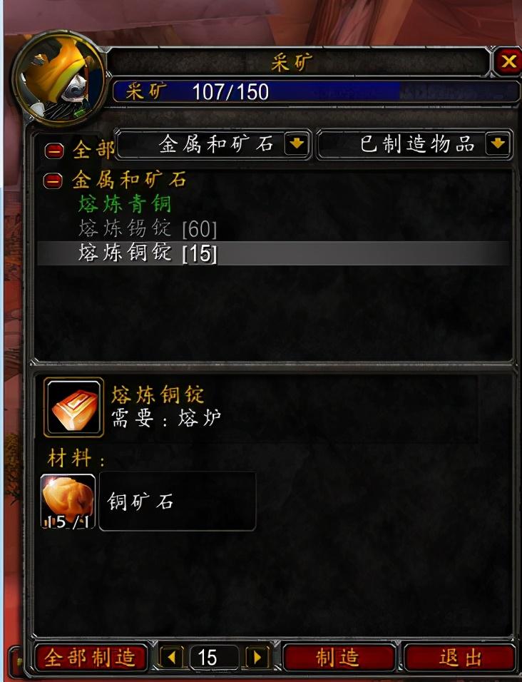 65-75使用锡锭,每种金属的一直练到灰色就行。这里我用了120个铜矿从1熔炼到了65,到65就可以学习熔炼锡锭和青铜锭了,然后用30个锡矿石熔炼到了75。在这个阶段大家可以拍卖行查询下锡矿石、铜矿石与青铜锭的价格,由于现在冲锻造的也很多,对于青铜锭的消耗还是很大,基本上熔炼完在卖出去都是不亏的。