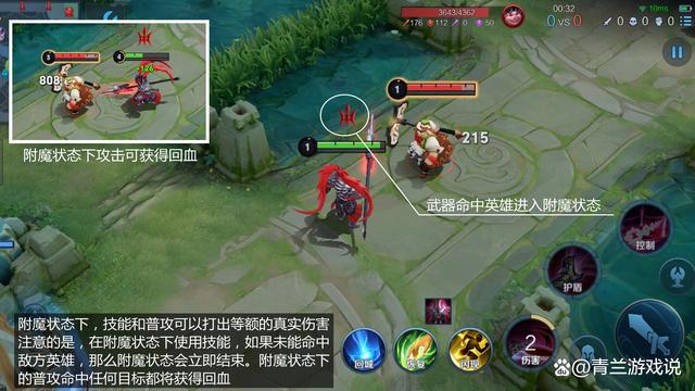 需要注意的是,在附魔状态下使用技能,如果未能命中敌方英雄,那么附魔状态会立即结束。附魔状态下的普攻命中任何目标都将获得回血。