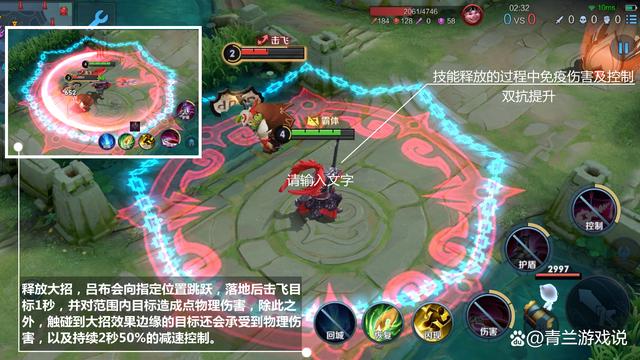 释放吕布大招时,会向指定位置进行标记,并获得标记位置的视野,除此之外在跳跃落地之后,吕布1技能的攻击范围将会提升,并且还会额外获得150(+50/Lv)点双抗。