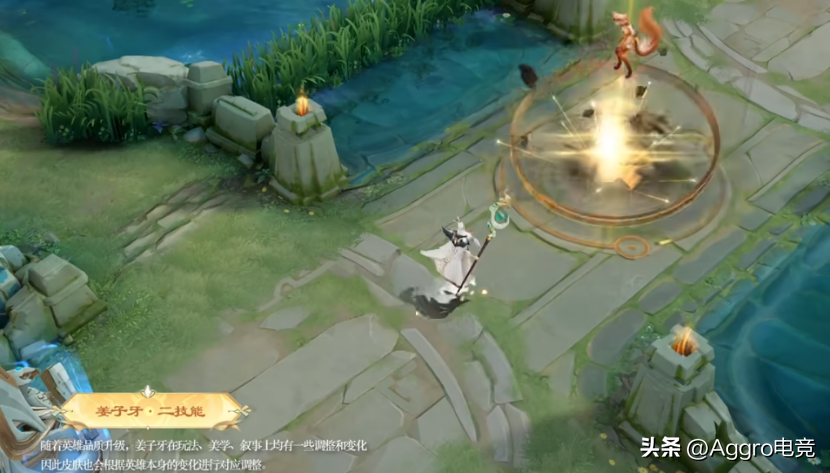 除了这个过于亮眼的被动技能外,姜子牙的一技能和原来并无太大差别。当姜子牙释放一技能造成伤害的同时,也会对目标造成降低双抗、减速以及增加自己移速的效果。不过在姜子牙二技能上,全新的机制让其变为一个需要技巧的控制。当姜子牙释放二技能时,将产生一个固定的法阵对敌人造成三次伤害,并在短暂的延迟后造成击飞和伤害。