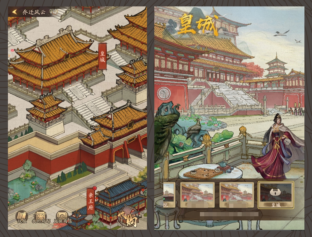 比如游戏上线初期就引入了乔迁玩法。游戏内设定的是玩家门客的赚钱能力越强,住到的地段就会越好。而基于“住”,他们随后加入了厢房装饰的玩法,更能够给到用户“家”的感觉,同时也是丰富玩家体验的举措。