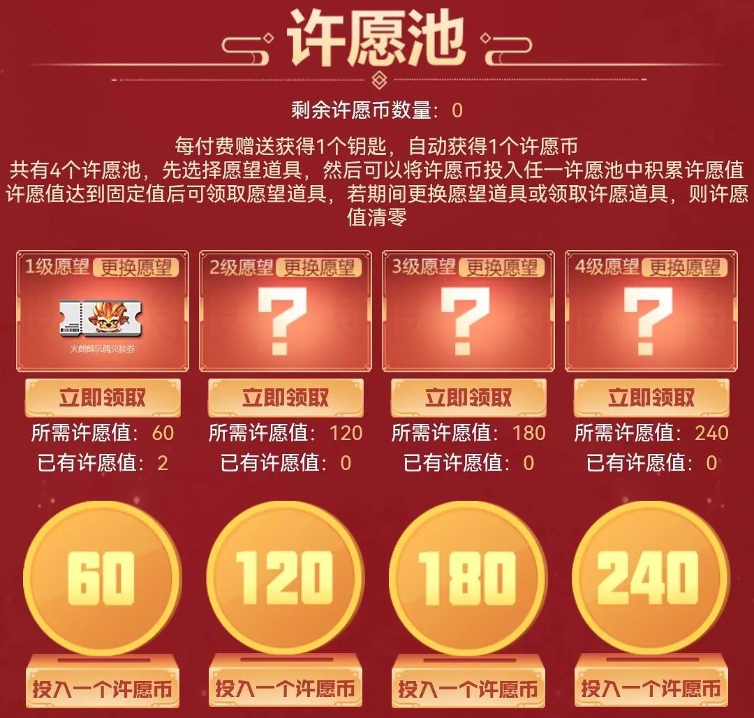 许愿池:每付费购买获得1个钥匙自动获得1个许愿币。共有4个许愿池,分别对应不同的愿望道具,选择愿望道具后,可以将许愿币投入任一许愿池中积累许愿值,许愿值达到固定值后可领取愿望道具,若期间更换愿望道具或领取愿望道具,则许愿值清零。许愿获得道具不进暂存箱直接发往游戏内;