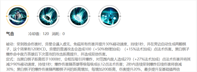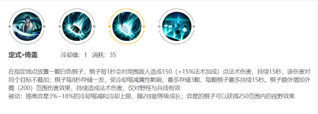 二技能:放置白色棋子,这个白色棋子有持续法术伤害,其他数据与一技能相同。另外,二技能被动能够增加弈星18%冷却缩减,这个冷却缩减是可以突破40%冷却上限的,也就是弈星最大能够减少58%的冷却缩减。