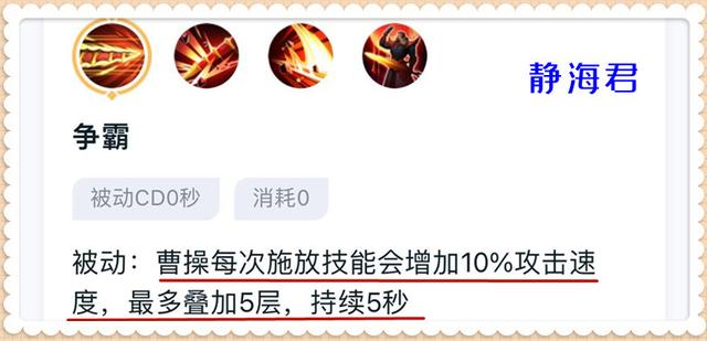 曹操的主要伤害来源是普通攻击,他的几个技能大都是为普攻服务的,比如被动技能提供的攻速,比如大招提供的额外物攻和吸血。