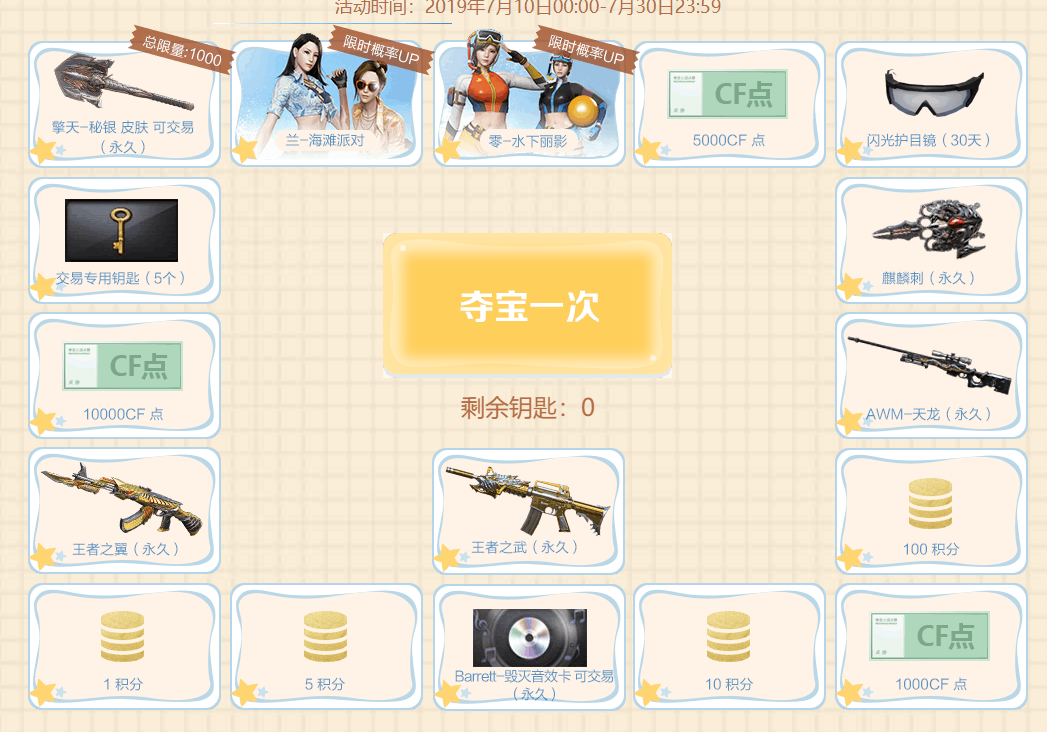 不知道,这次的抽奖的活动道具有没有大家喜欢的呢!我觉得!除了音效卡!和两个泳装皮肤!其他恐怕没有什么吸力吧!对我来说!