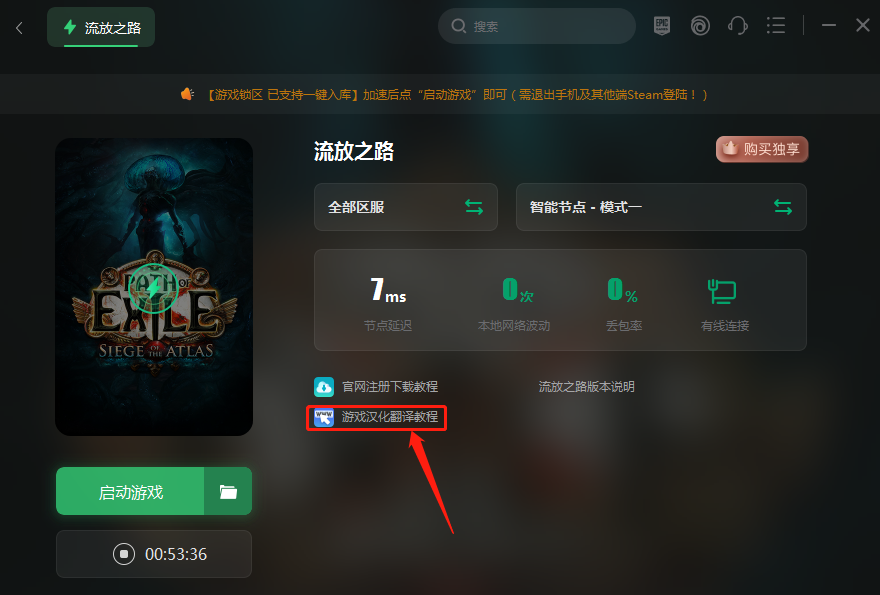 打开下面的加速工具,搜索流放之路,完成加速处理之后点击详情界面的游戏汉化翻译教程。