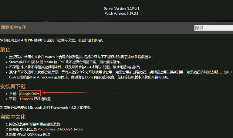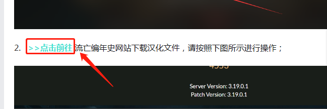 在弹出的网站内点击步骤二的“点击前往”去流亡编年史网站下载汉化文件,按照下图所示操作即可。