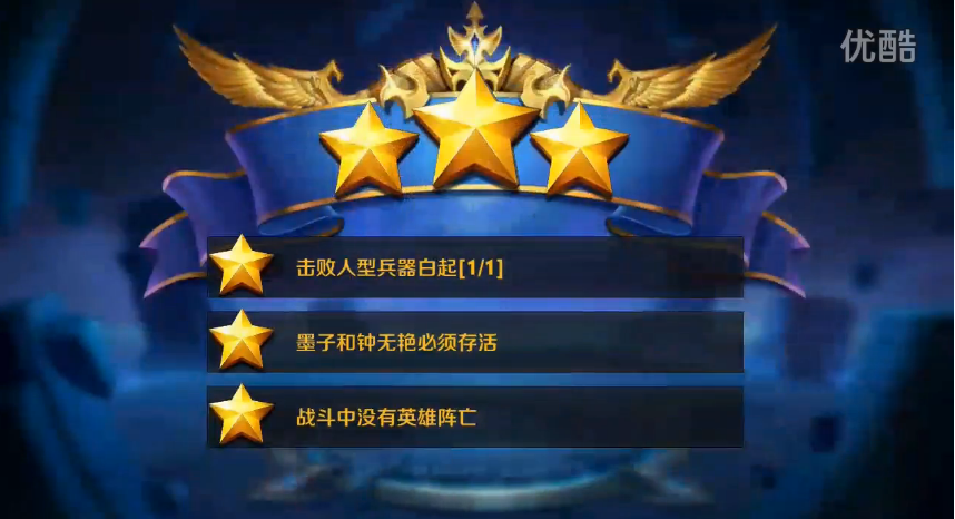 通关要求:击杀人型兵器白起、墨子和钟无艳必须活着、战斗中没有英雄阵亡