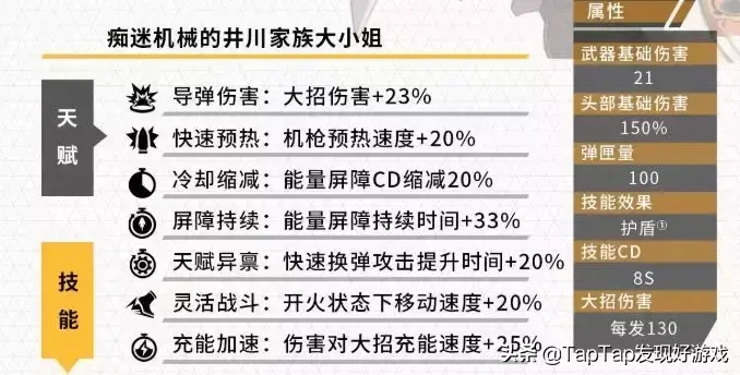 加特林机枪和导弹发射器为她提供了十分强悍的爆发和压制能力,但这身沉重的机甲会影响她的灵活性。