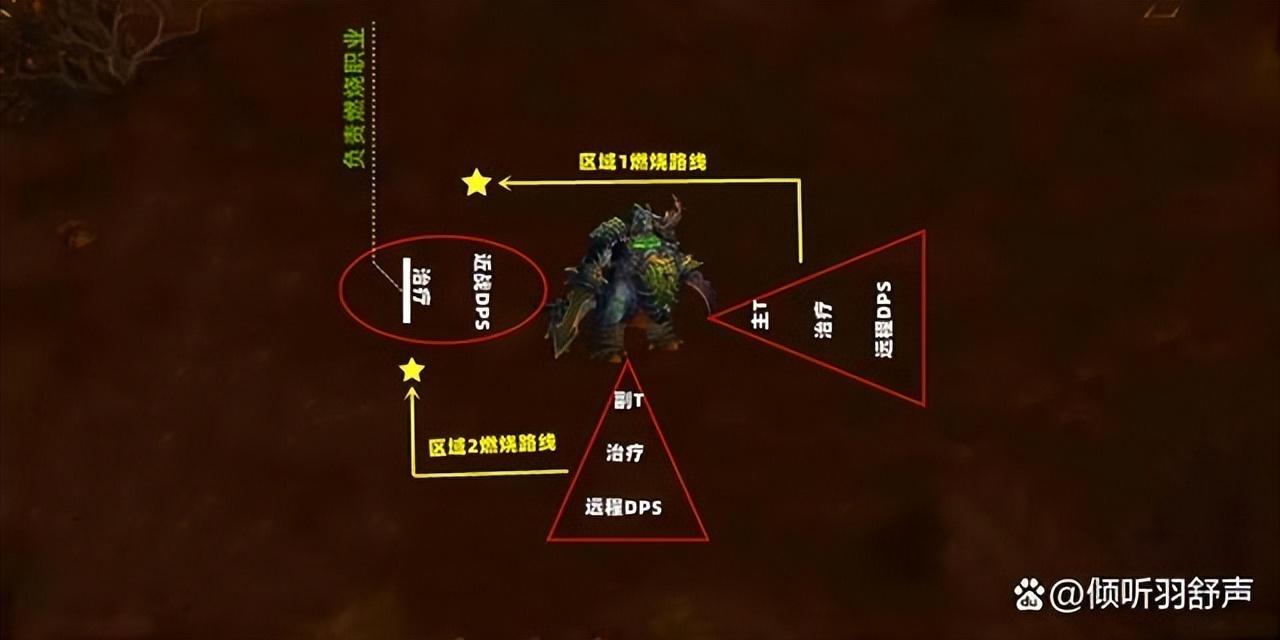 开始后分三个区域5码分散站位,出近战和刷点燃治疗一个区域外,剩下职业平局分布AB两个区域,治疗站中间,远程DPS站后面,被点燃职业第一时间按路线跑出人群抵达救济区自救补给,如果刷T治疗被点门,需其他治疗补位。