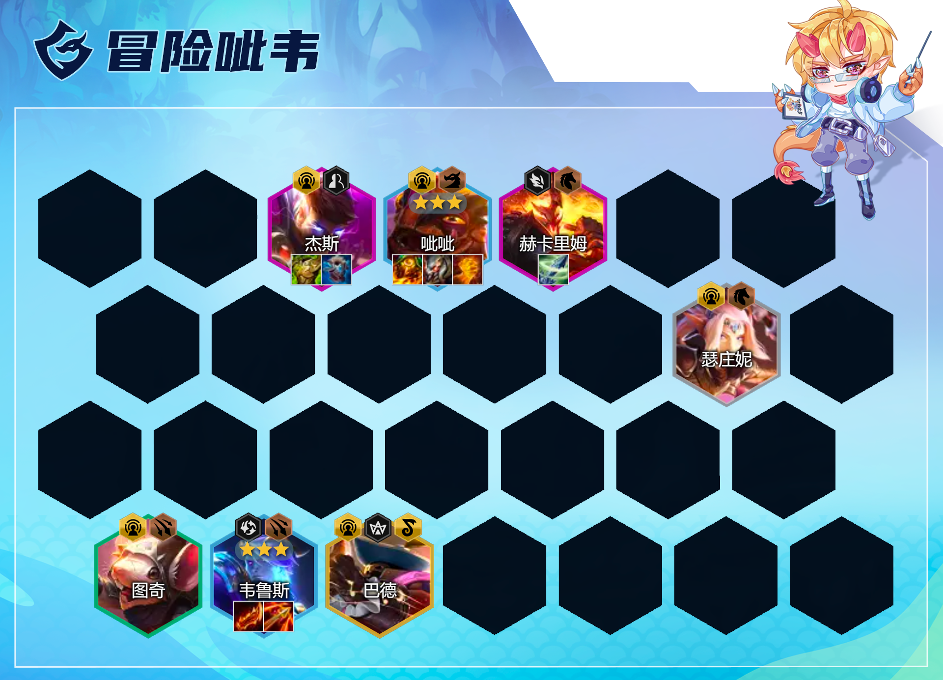 首先说的就是冒险体系,这版本由于霞被小砍,1星霞锁血能力堪忧,现在冒险霞玩家选择率大幅度下滑,不是说没人玩,成型后吃分算稳,但强度大不如前,非常容易被呲呲一滚带走C位。