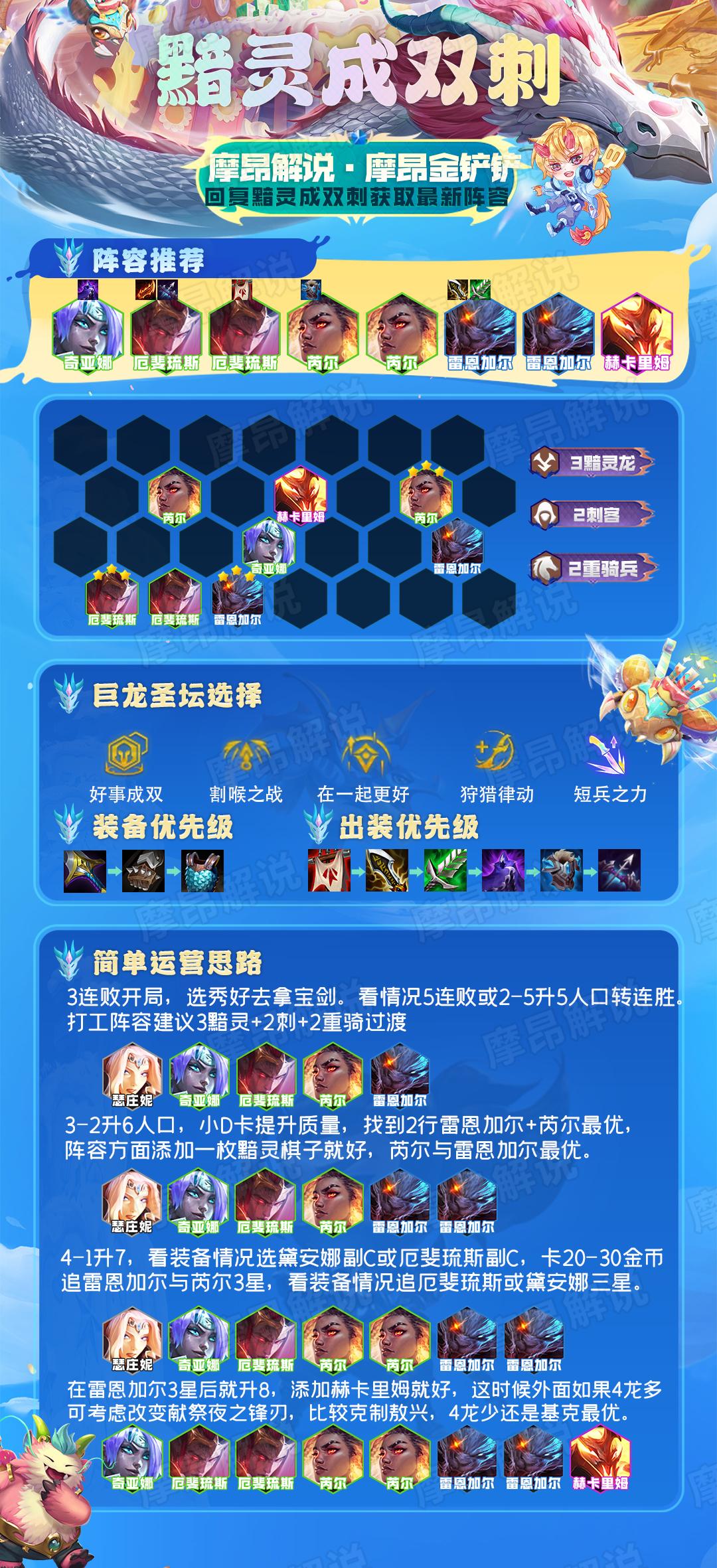 幽影玉龙这套阵容在这版本又活了过来,这套阵容摩昂测试多局,阵容变阵也比较多挂2换形或2狂刃或巴德与索拉卡的人都又,整体来看吃分算比较稳定的。但这套阵容今天玩的人也开始多了起来,对双龙来说装备要求还是比较高,大成型略难一些。