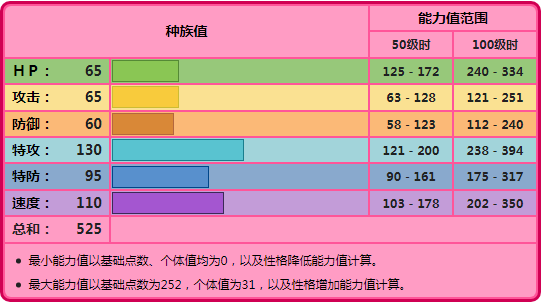 在种族值的分布上,太阳伊布有着很直白的特点——高攻、高速,且最高的一项还放在了输出上,所以有着130高特攻的太阳伊布无疑有着一定的输出能力,且加上110的速度也不低,但问题是,高速高攻的纯超能力系在对战上可不少见,我们所熟悉的胡大师胡地,不管是在速度上还是特攻上都要比太阳伊布高,且还有着一样的特防,只是物耐端以及HP相较太阳伊布少一些,但毕竟本身定位就是输出手,少那么一点物耐其实倒也无伤大雅。