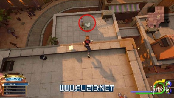幸运徽章5:位于电影院区旁边的一栋建筑上(从电影院区正门直接从您面前驶出后)。在这座建筑物上有两张椅子和一张小餐桌。桌子上有3个白色的盘子,看起来像米老鼠的图标。你可以从楼顶俯视阳台拍摄。