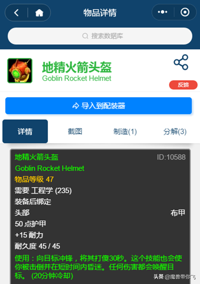 需要工程205,装备后绑定,使用时无需地精工程学。