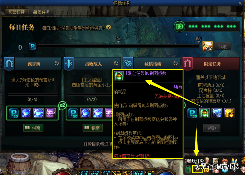 目前刷图点获取改版,消耗疲劳不再获得刷图点,每日限定任务可获得10刷图点,所以常玩的号每天必做限定任务,领10点刷图点。