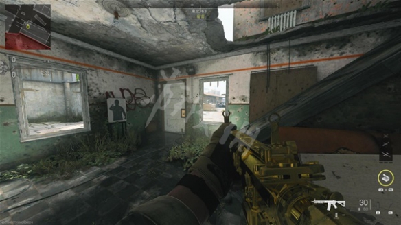 宿舍一楼,可以看到攻坚外面跟指挥室屋顶,我也很常在这里打击指挥室的狙击手,这也是蛮常看到人的龟点之一,但在这龟到人的效益我觉得没有其他两个那么高就是(加上我进宿舍一楼都是想炸二楼的Camper。