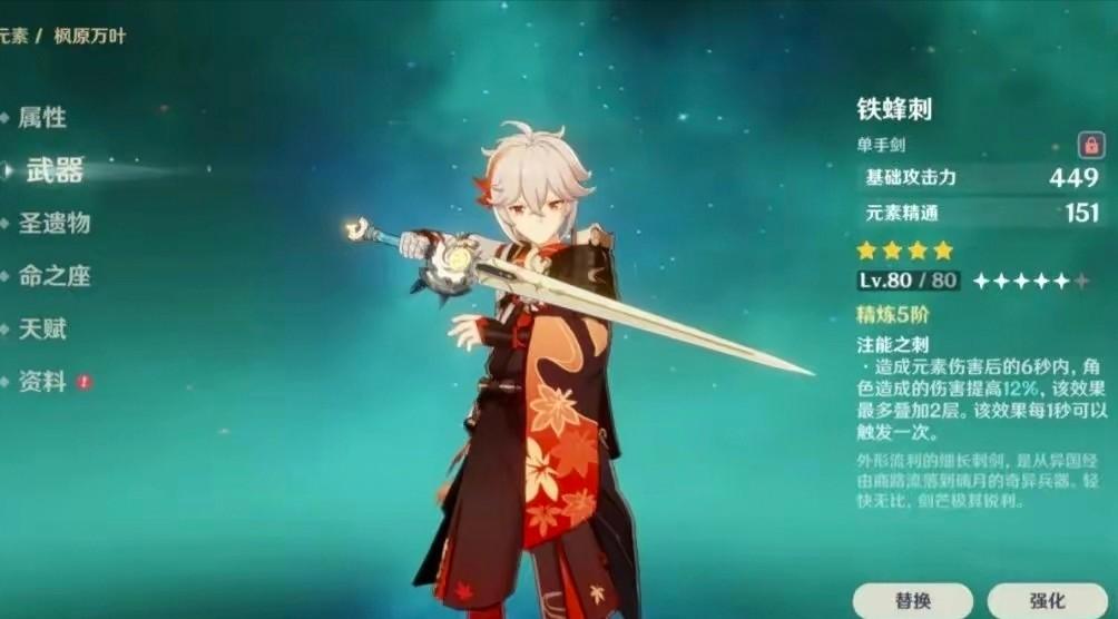 首先以不同战斗环境的优先度来看,假如你是要找一个苍古的替代武器,也不缺元素充能的情况下,以提供元素精通的铁蜂刺最适合,而因为万叶并不是站场输出角色,铁蜂刺的被动效果万叶不需要,所以也只需要精炼1要它的副属性即可。在大多数环境下从副属性所提供的元素精通可以带来些微的增伤,但也就这个效果而已,因为这把武器的被动效果跟万叶的扩散没有关系,用铁锋刺的另外一个好处是比较不会和其他角色抢武器。而三星的暗铁剑,也是提供元素精通,算是铁蜂刺的再下位替代,而且无法再精炼上去,如果是缺原胚打造铁蜂刺的人可以考虑使用,只要去璃月找到NPC快刀陈对话就可以直接拿到。