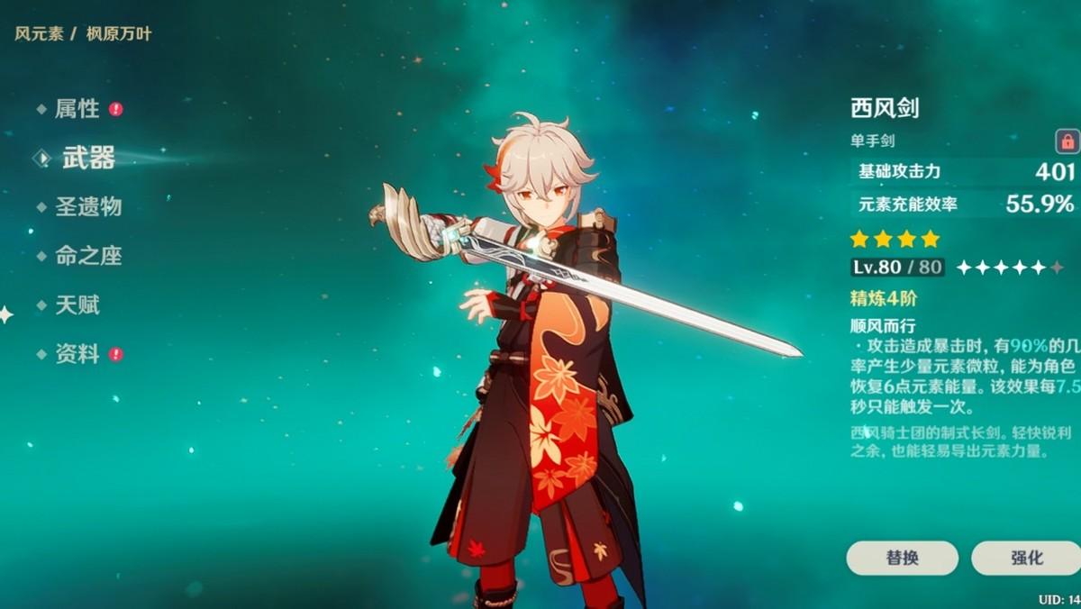 然而若是遇到只有一两只敌人的对单情形时,则会建议可以使用高精炼西风剑,通过普攻对怪物造成暴击使怪物产生元素微粒来充能,同时也需要撑一些暴率面板。西风剑和祭礼剑一样满级时提供61.3%的充能,都是能够缓解万叶需要充能情况的武器选择,两者主要的差异在于一个适合对群,一个适合对单,通常在对群的时候因为怪物多,元素微粒也产得多,所以不太缺充能,但如果是对单像是只有魔偶剑鬼一名敌人的时候,西风剑提供的元素微粒效率就会比起祭礼剑还有铁蜂刺要好,加上万叶的五段式普攻总共可以打出8次伤害,也能快速触发西风剑的被动效果产生元素微粒,使用这把武器要能更好的触发被动的话,也会建议要精炼等级越高越好。