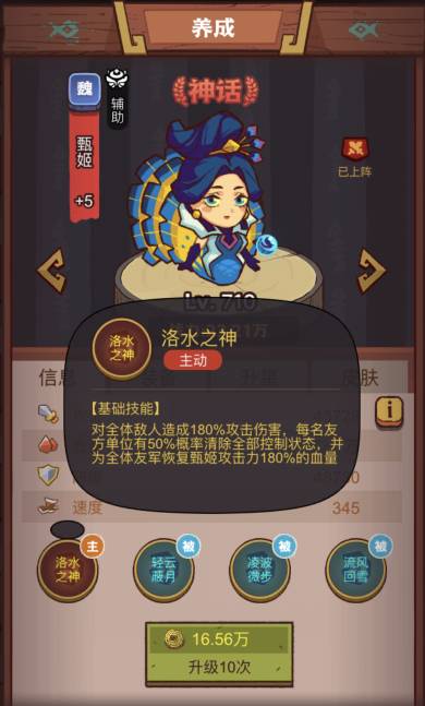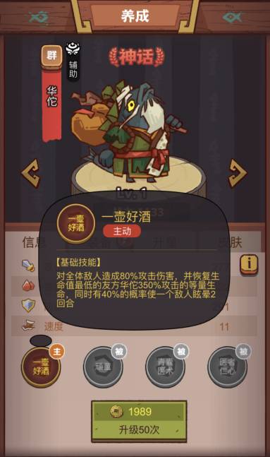 华佗:华佗作为游戏中辅助型的咸将,最主要的技能就是为队友回复血量,华佗的主动技能效果是对全体敌人造成80%攻击伤害,并恢复生命值最低的友方华佗350%攻击的等量生同时有40%的概率使一个敌人眩晕2回合。