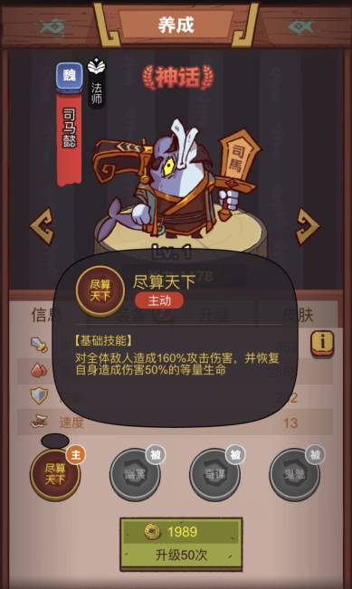 司马懿:主动技能对全体敌人造成160%攻击伤害,并恢复自身造成伤害50%的等量生命。