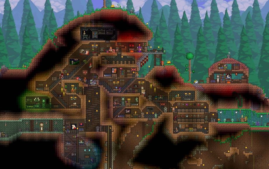 后来误打误撞进了剑冢,就得到了附魔剑(那个远程攻击甚合我意,当时也不知道有真空刃)。然后才知道有boss要打,旧三王杀了以后跑图打怪买了迷你鲨,合成流星弹之后就听我同学的打了肉山。现在想想这个打法挺邪门的,还建议萌新肉山前多囤一些洞穴探险药水,前期不太用得着,但困难模式初期找精金/钛金矿,打完三王找生命果的时候会用到不少。