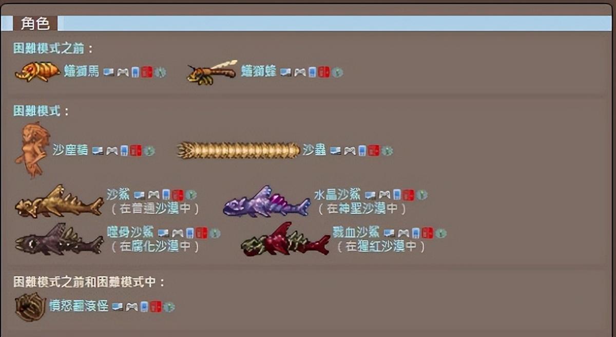 2. 在电脑版、主机版、移动版和任天堂Switch版中,满足条件时,沙尘暴每次有1/84600 的概率发生。在tModLoader支持版本中,沙尘暴有1/518400 的概率发生。在击败克苏鲁之眼之前,它们发生概率更低。