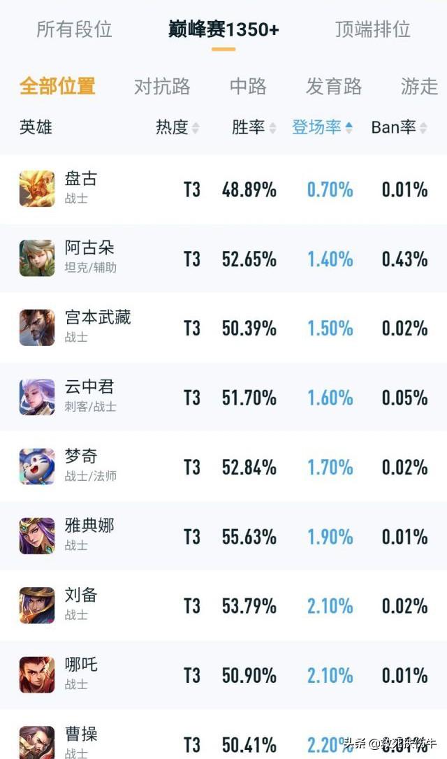 王者荣耀现在1350榜单的出场率倒数10个英雄里,盘古是唯一胜率不到50的英雄,其他英雄哪怕冷门,可能是又冷又强,就只有盘古,是真的因为弱势才导致的冷门。