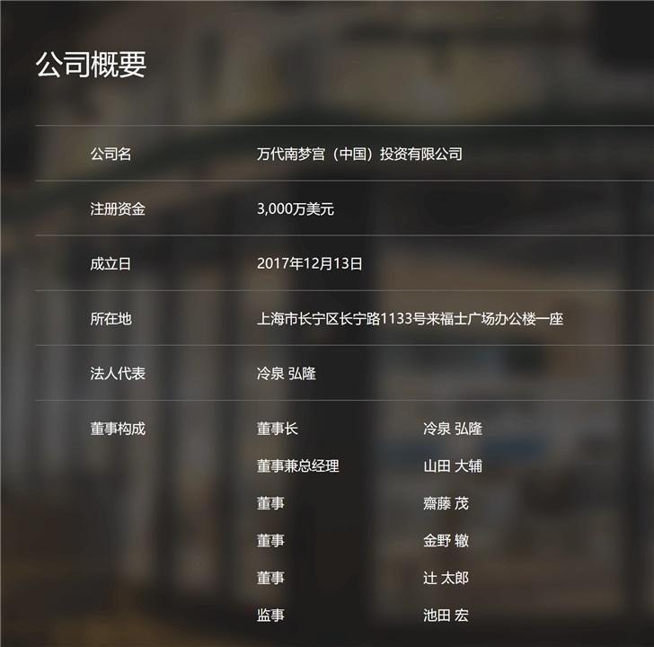 据介绍,万代南梦宫(中国)是日本万代南梦宫控股公司在中国成立的独资区域性管理公司,于2017年12月13日在上海成立,负责万代南梦宫集团在中国事业的整体统筹和集团品牌经营。