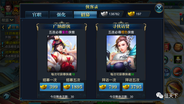 如果大家是氪金玩家不在乎几千元宝的话,就可以进行侠客抽取了。侠客依照自己的品质不同,给玩家增加的属性值也不同,如果抽到了极品侠客,玩家的战斗力能一次性提升好几万。一次五连抽如果运气一般的话,可以增加一到两万的战斗力,如果运气爆棚就是五六万了。