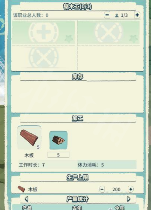 水上锯木厂最大容纳人数3,工作时长7,单位木板产出5。所以极限产量是36÷7(向下取整)*5*3 =765。即在不算任何加成的情况下水上锯木厂一年产木板765个。