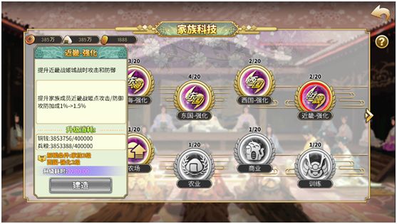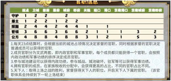 3,家族科技和官职,通过消耗家族判金来进行科技升级,可提升家族所有成员的(东海、东国、西国)战姬的攻击力和家族资源的增产速度,只要家族到达一定等级就会开放此功能。官职需要自己家族有占领的城池,晚上11点通过家督进行封官加爵,官职分为文官跟武官,每个成员只能有一个官职。